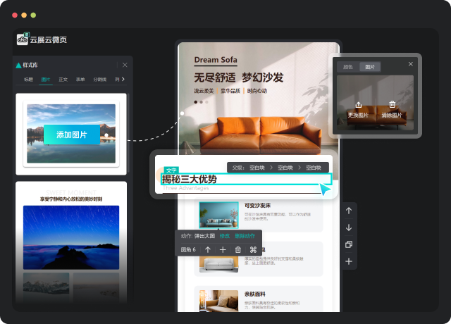 提供標(biāo)題、圖文、表單、Banner等模塊化組件,可以靈活替換和組合讓設(shè)計網(wǎng)頁就