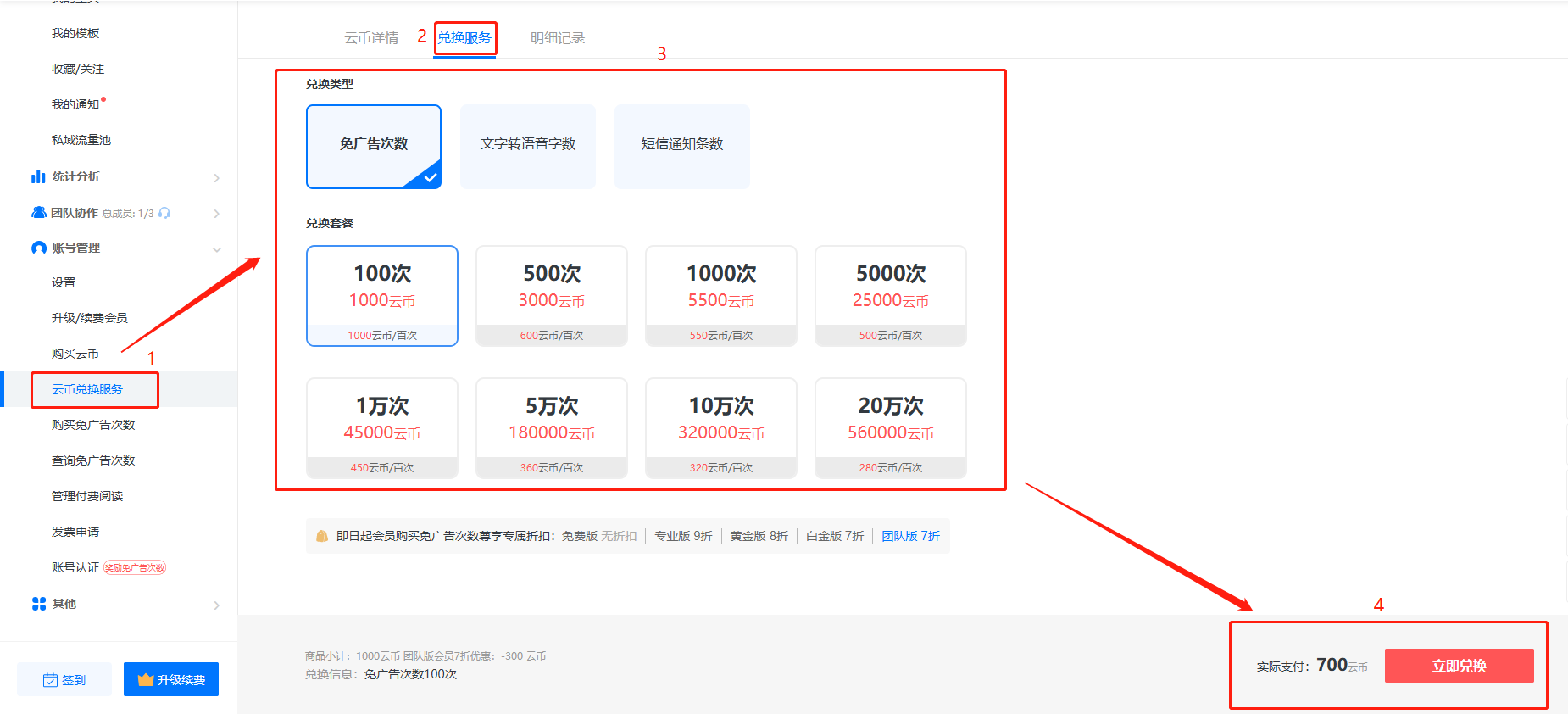 點(diǎn)擊【云幣兌換服務(wù)】,再點(diǎn)擊【兌換服務(wù)】,選擇需要的類(lèi)型和套餐,然后右下方點(diǎn)擊立即兌換,最后點(diǎn)擊彈出的詳情框的兌換即可。