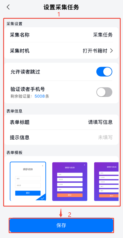 為了提高作者跟讀者之間的互動溝通,我們開發(fā)了采集信息功能,通過應用不同模板,您可以要求讀者填寫他的名字,手機號,微信號等才能繼續(xù)閱讀書本/書櫥,不僅可以獲取潛在有意向的客戶數(shù)據(jù),還可以提高您與讀者之間的交互。