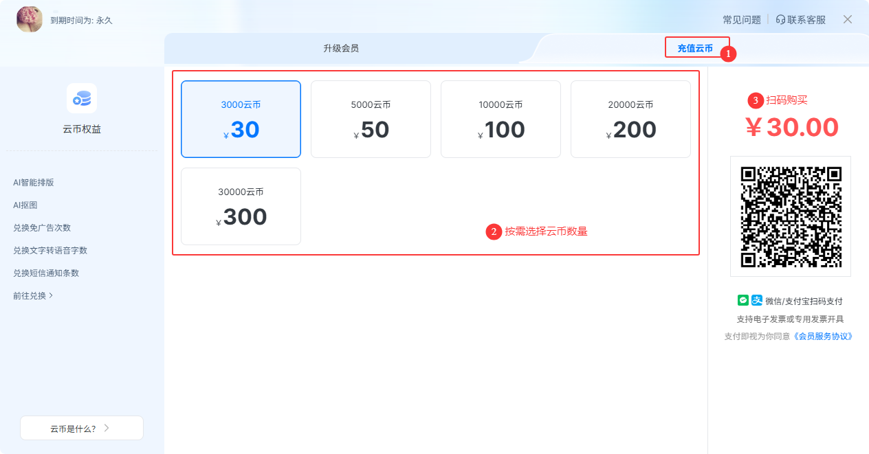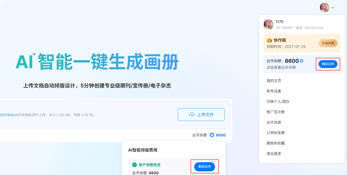 點擊右上角的頭像,或者在【上傳文件】按鈕下方, 鼠標懸浮在云幣數(shù)值上,均可查看當前賬號剩余云幣或點擊【購買云幣】,根據(jù)自身需要選擇購買更多云幣。