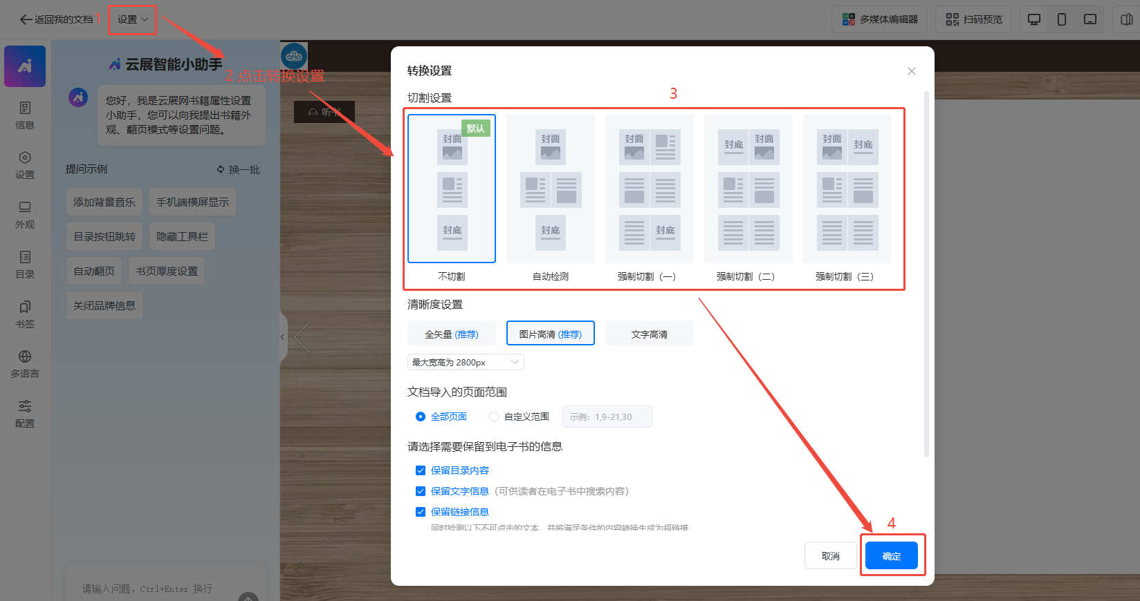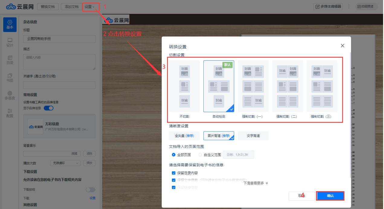 在【文檔】頁面,點擊【新建文檔】里面的【上傳文檔】,點擊【轉換設置】,選擇切割方式后點擊【確定】。