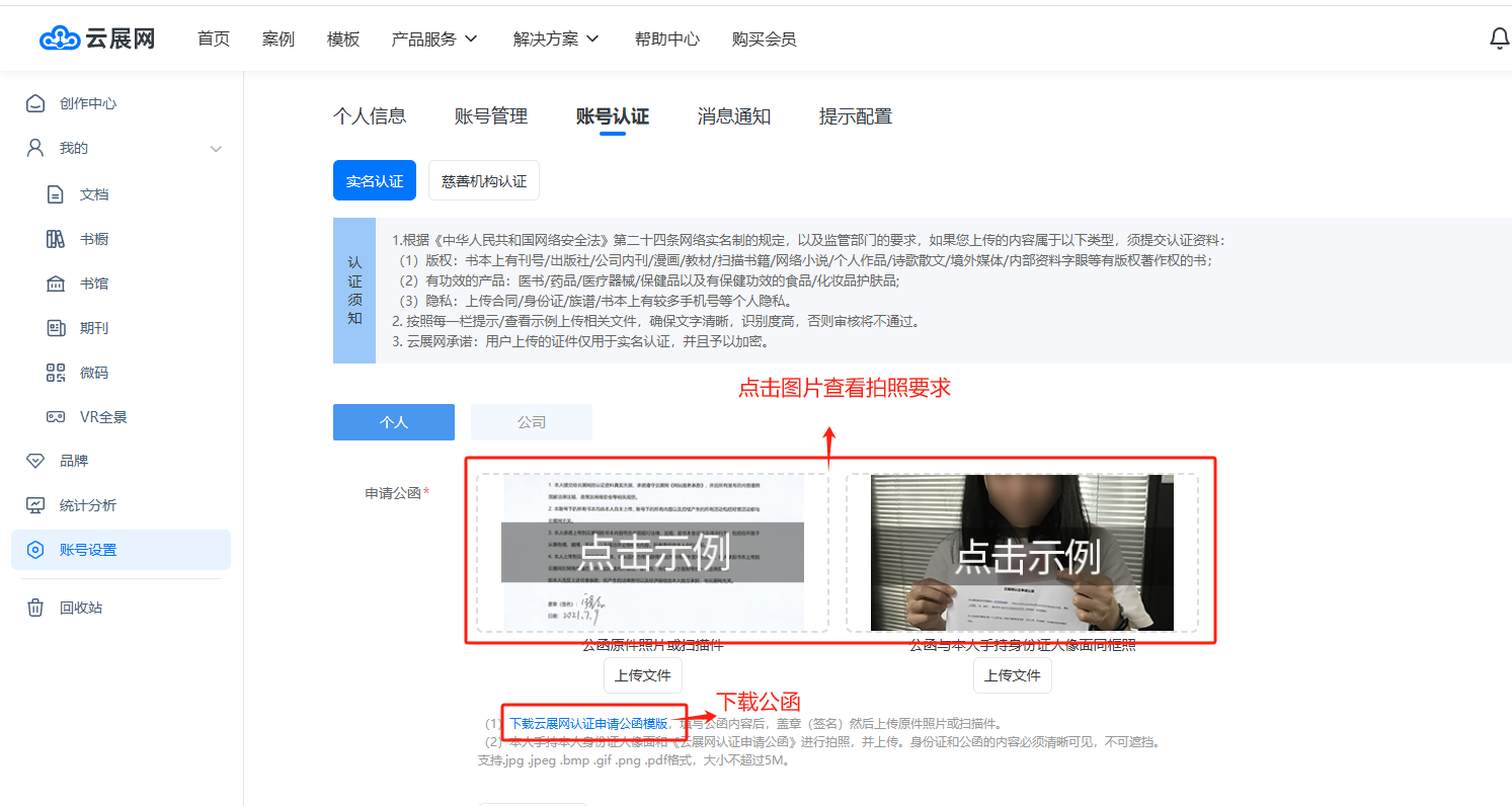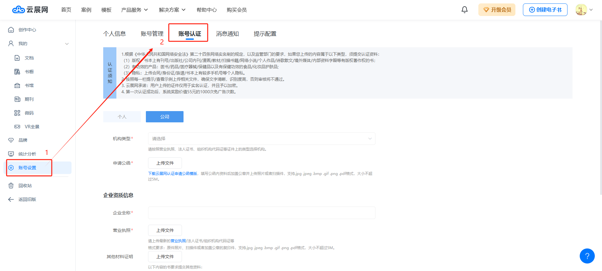 電腦登錄云展網(wǎng)網(wǎng)站,登錄您的賬號(hào),點(diǎn)擊【賬號(hào)設(shè)置】,點(diǎn)擊【賬號(hào)認(rèn)證】打開賬號(hào)認(rèn)證界面