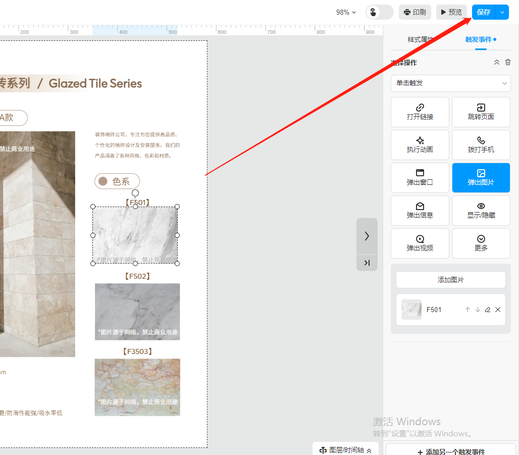 選中需要設(shè)置的文字或者圖片,然后在【觸發(fā)事件】選擇【彈出圖片】點擊添加圖片;如果是選擇圖片設(shè)置彈出大圖,可直接點擊【快速添加本圖】快速添加圖片