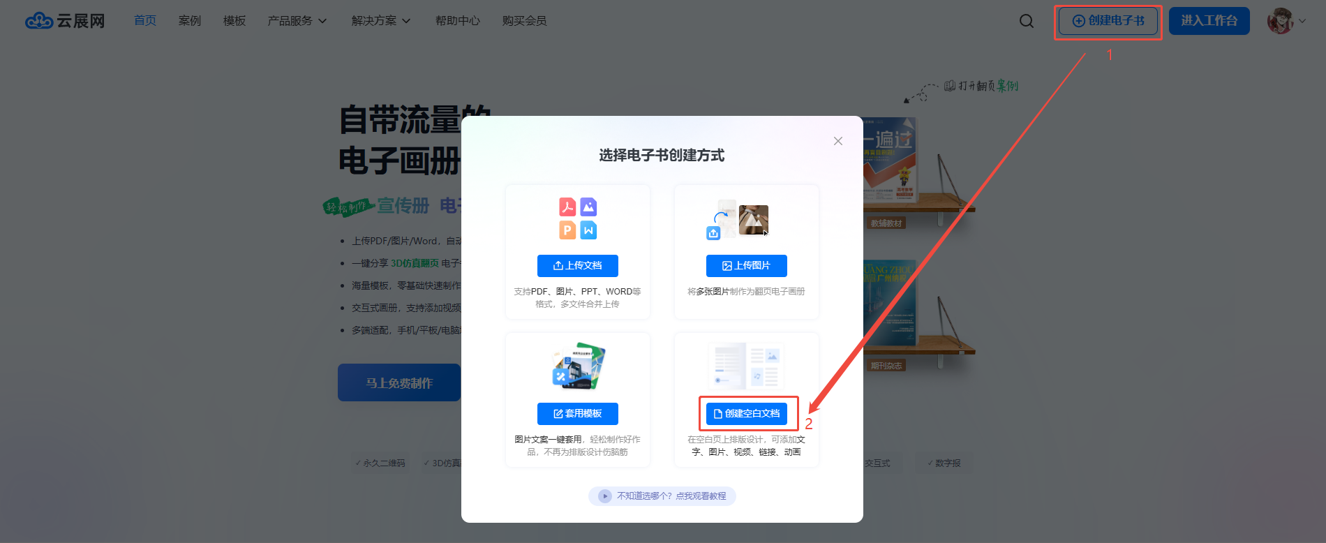 進入云展網(wǎng)首頁,登錄你的賬號,點擊【免費制作】,進入電子書創(chuàng)建方式操作界面后,點擊【創(chuàng)建空白文檔】。