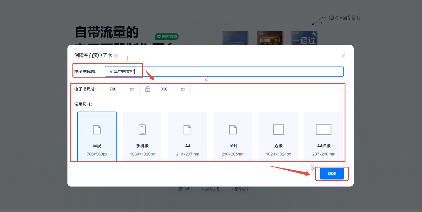 輸入電子書標(biāo)題并選擇尺寸,并點擊【創(chuàng)建】。在這里設(shè)置標(biāo)題與尺寸,你可以選擇平臺預(yù)設(shè)尺寸,也可以根據(jù)需求設(shè)置你需要的尺寸大小。