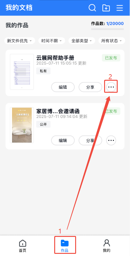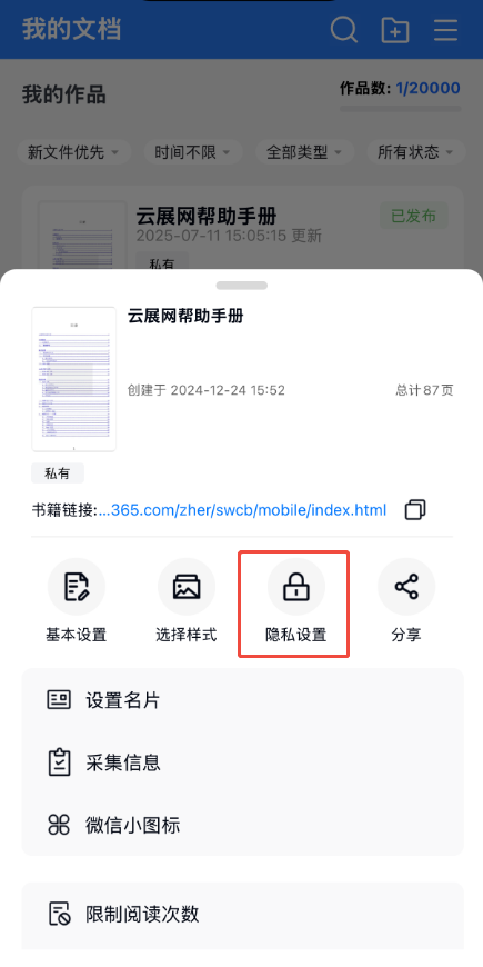打開云展app,點(diǎn)擊【作品】,點(diǎn)擊書本旁邊三個(gè)點(diǎn),然后點(diǎn)擊【隱私設(shè)置】。