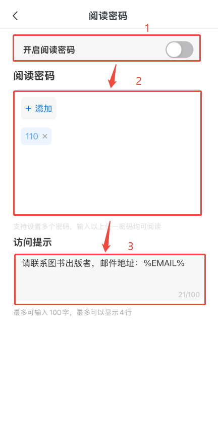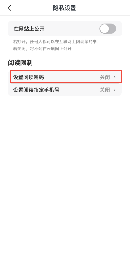 點(diǎn)擊【設(shè)置閱讀密碼】,將【開啟閱讀密碼】打開,在下方密碼框輸入密碼,可以輸入一個(gè)或者多個(gè),也可以根據(jù)自己需要設(shè)置訪問提示,設(shè)置完點(diǎn)左上角箭頭退出即可。