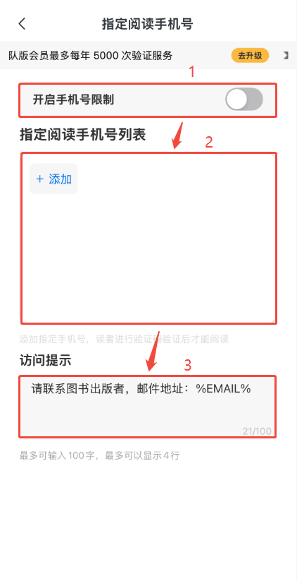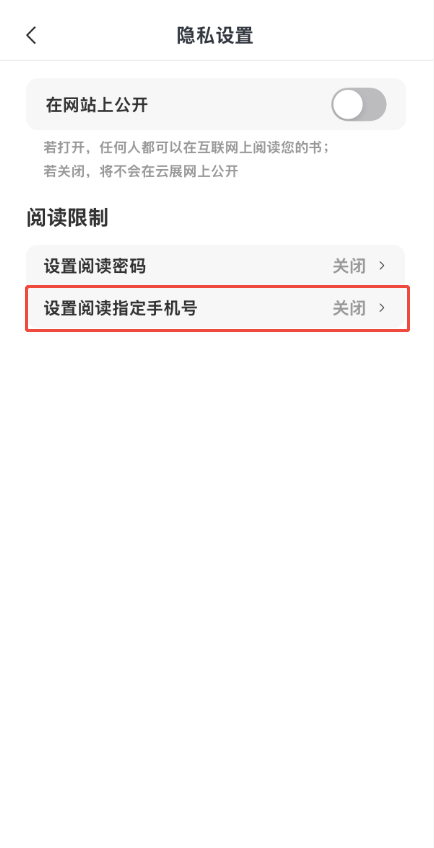 點(diǎn)擊【設(shè)置閱讀指定手機(jī)號】,將【開啟手機(jī)號限制】打開,在下方手機(jī)號列表框輸入手機(jī)號,可以輸入一個(gè)或者多個(gè),也可以根據(jù)自己需要設(shè)置訪問提示,設(shè)置完點(diǎn)左上角箭頭退出即可。