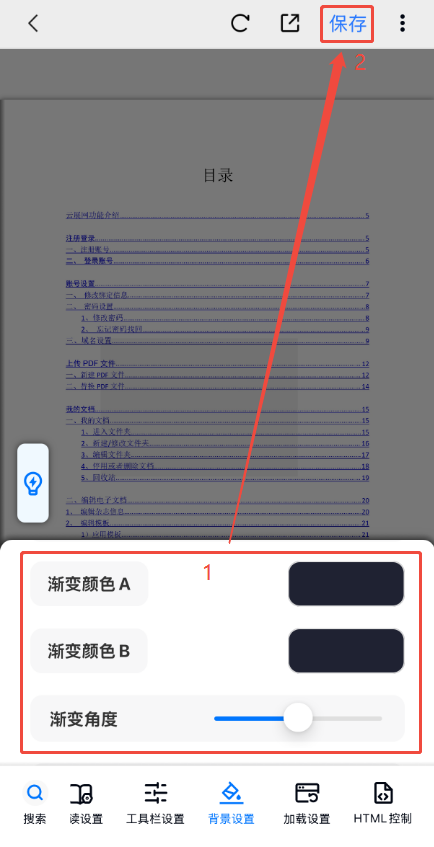 點(diǎn)擊左下角【搜索】,在搜索框輸入【漸變顏色】,然后點(diǎn)擊【漸變顏色A】或者【漸變顏色B】,選擇顏色以及調(diào)整漸變角度后,點(diǎn)擊右上角【保存】即可。