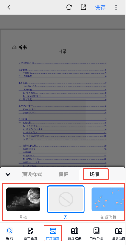 點(diǎn)擊【樣式設(shè)置】,然后點(diǎn)擊【場(chǎng)景】,可以看到云展網(wǎng)提供的動(dòng)態(tài)背景,根據(jù)自身喜好選擇即可,左滑可以查看更多場(chǎng)景。