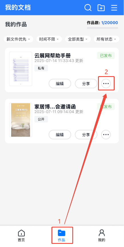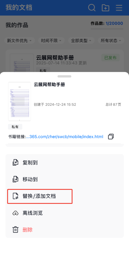 點擊【作品】,點擊對應(yīng)電子書右邊的三個點,然后點擊【替換/添加文檔】,打開替換文檔界面。