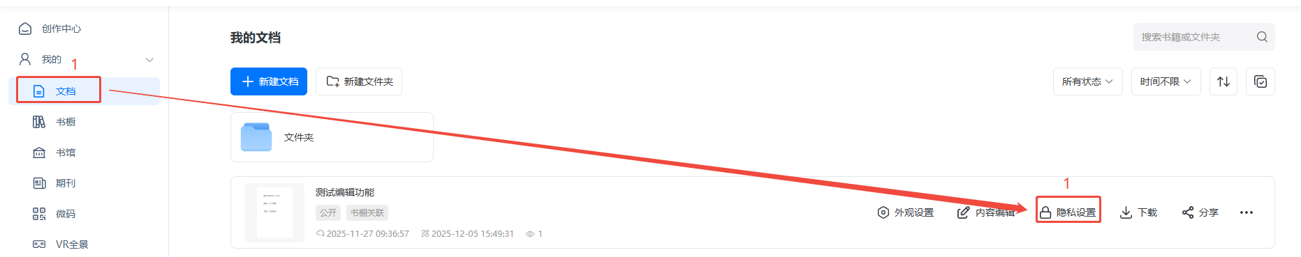 點(diǎn)擊【文檔】,找到對(duì)應(yīng)的電子畫冊(cè),點(diǎn)擊【隱私設(shè)置】。