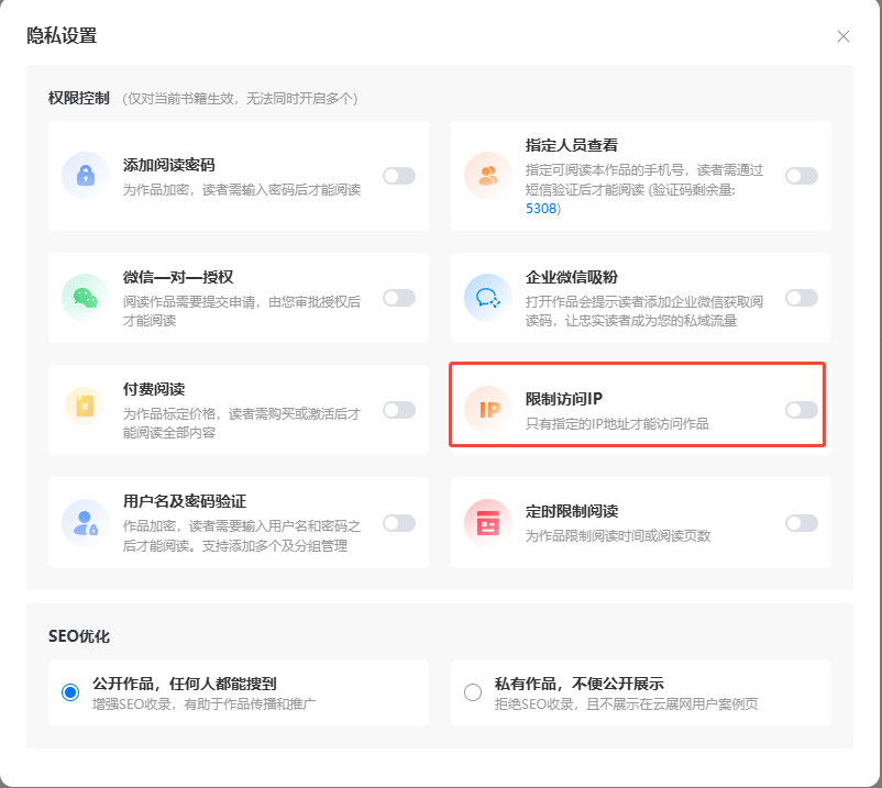 如果你的電子書有較高的保密要求,不可公開,只能給特定的設(shè)備或人員查看,你可以設(shè)置限制訪問IP功能。限制訪問IP功能是指作者在后臺(tái)設(shè)置了IP地址白名單,在白名單內(nèi)的讀者才可以打開書本查看。