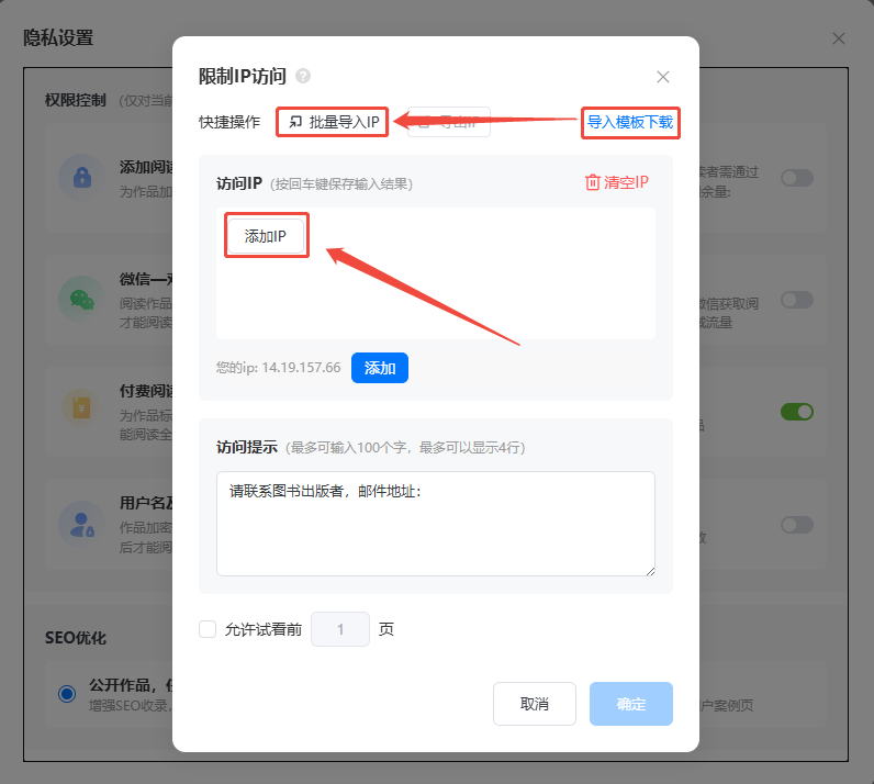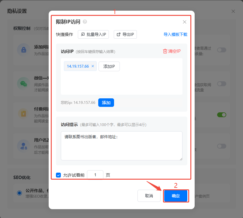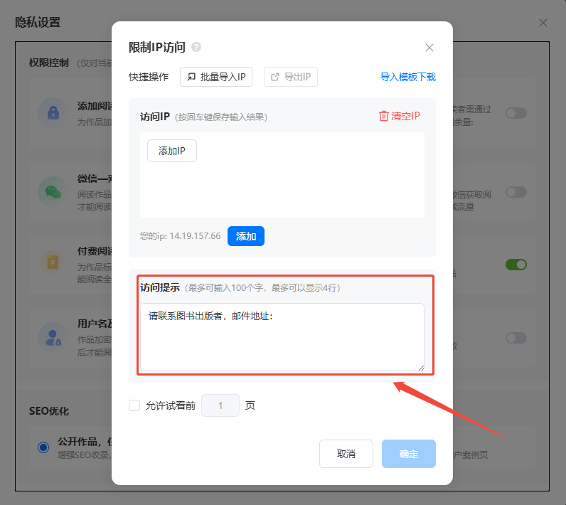 分享書籍給讀者,不在白名單上的讀者打開書本就會(huì)彈出IP訪問權(quán)限提示。