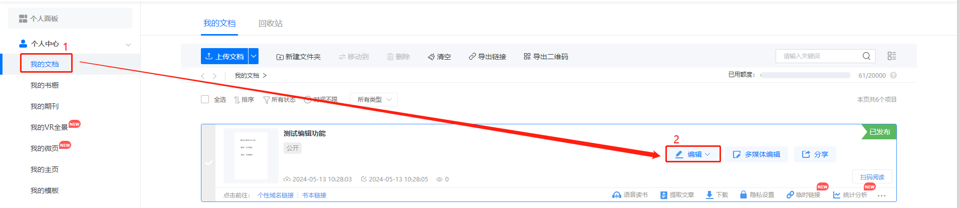 點(diǎn)擊【我的文檔】,點(diǎn)擊設(shè)置好配置的畫(huà)冊(cè)的【編輯】,打開(kāi)編輯界面。