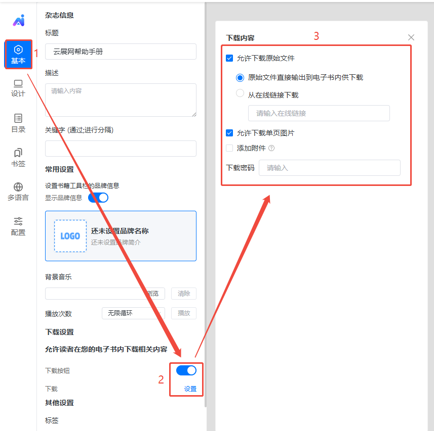 點(diǎn)擊【基本】,下方打開下載按鈕,電子書的工具欄上就會(huì)出現(xiàn)下載按鈕,然后點(diǎn)擊【設(shè)置】,設(shè)置下載內(nèi)容。