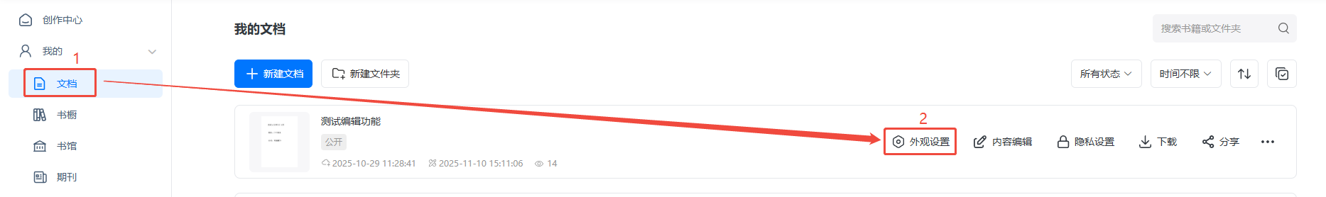 點擊【文檔】,選擇需要設(shè)置的電子書,點擊【外觀設(shè)置】。