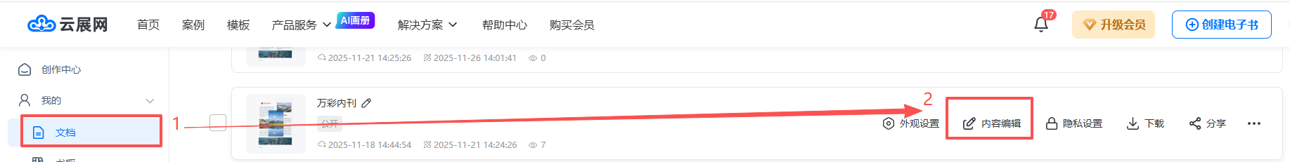 在【文檔】頁(yè)面,找到需要編輯的書,點(diǎn)擊【內(nèi)容編輯】。